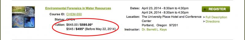 There are a lot of prices on there, right? I mean, $645/$595, $545/$495? Which price is the 2012 price? It is the "after discounts" price of $495 that is the 2012 price. I'll help clear this up: The price you see first ($645) is the full price of the course. The price in bold next to it ($595) is the price if you are an employee of a government agency or non-profit organization, a student, tribal member, or member of one of our partner organizations such as NEBC or LSRPA. The prices below that are the EARLY BIRD prices. And yes, we are offering a $100 discount for registering during the Early Bird period! That Early Bird price, with all of those discounts, was the same Early Bird price in 2012. So technically, we could say that we've returned our prices to the discounted prices from 2012. (Our CESCL, and CESCL Recertification courses had already been lowered to 2012 amounts, so these didn't change.)